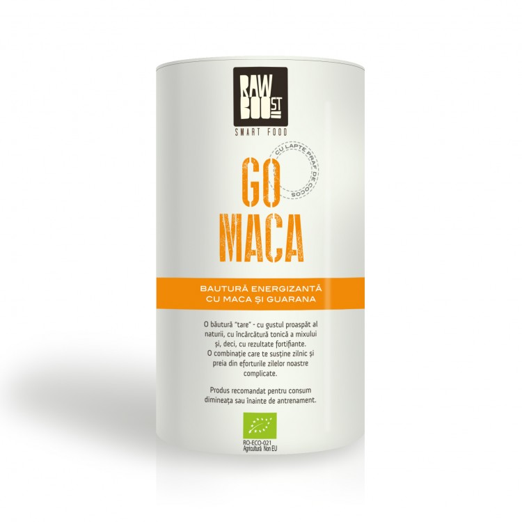 O băutură "tare", o combinație care ne susține zilnic și preia din eforturile noastre complicate. Go Maca este o băutură cu gust de ciocolată alcătuită dintr-o serie de ingrediente sănatoase, fortifiante naturale, recomandată a se consuma dimineața pentru o zi plină de energie sau înaintea antrenamentelor pentru un plus de vitalitate.